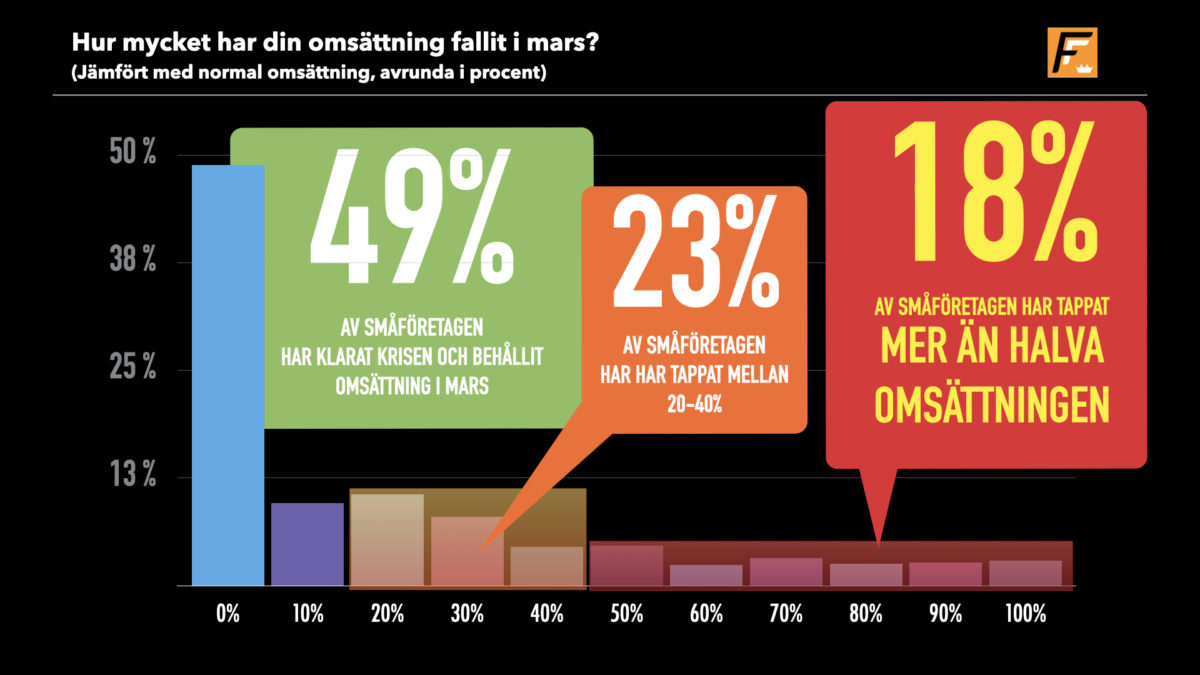 Mars blev ytterligare en svår månad för många småföretag! Bland Företagarförbundets medlemmar tappar 18 procent mer än halva omsättningen och hela 23 procent tappar mellan 20-40 procent av omsättningen jämfört med mars 2020. Andelen småföretag som inte tappade omsättning i mars var knappt hälften. Sedan pandemin startade i mars förra året har hälften av företagen endast klarat omsättningen i fyra av tretton månader.