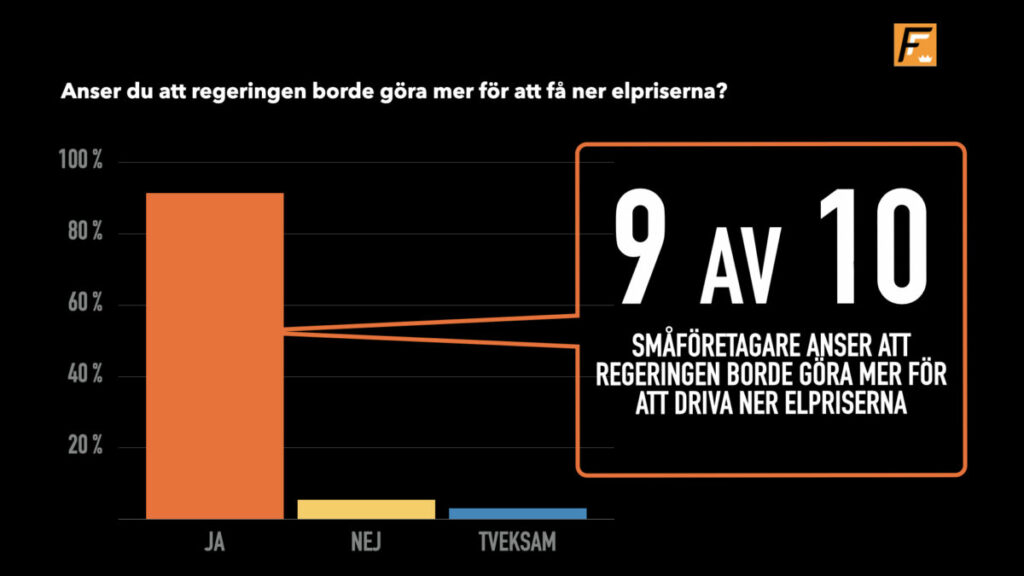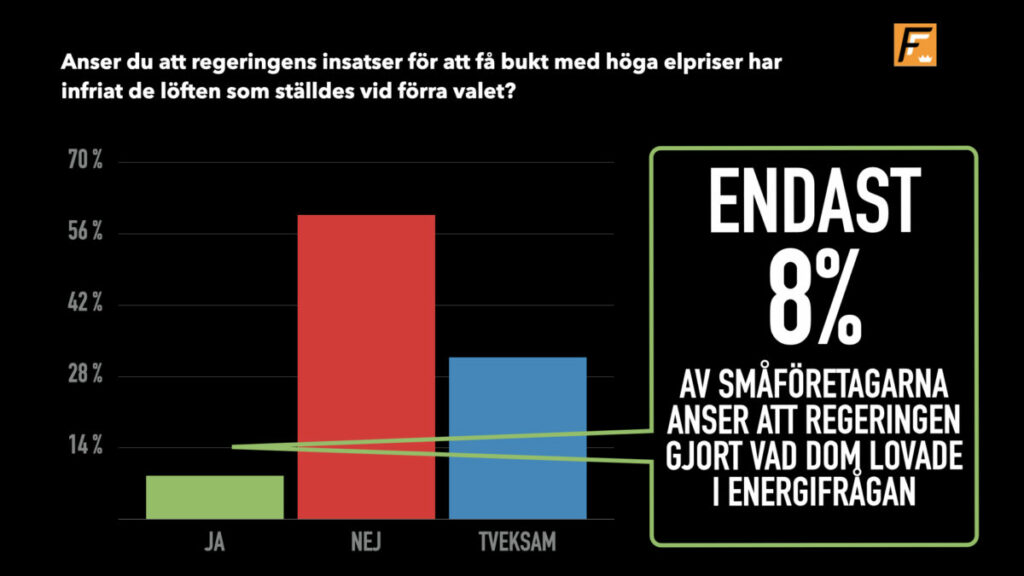 Rapporten visar också en tydlig politisk dimension. Förtroendet för regeringens hantering framstår som lågt: endast 8 procent anser att löften har infriats. Samtidigt tycker nio av tio att regeringen borde göra mer för att få ner elpriserna. Det signalerar inte bara missnöje, utan också att småföretagare förväntar sig konkreta åtgärder.